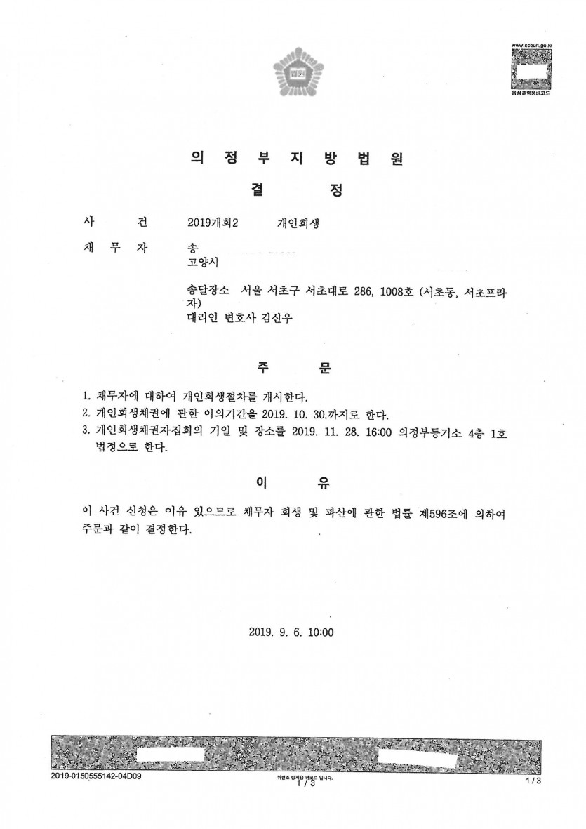 ***배우자명의의 부동산이 있어 청산가치에 맞추어 60개월간 변제하는 변제계획안으로, 15%의 낮은 변제율로 개시결정이 된 사례입니다.