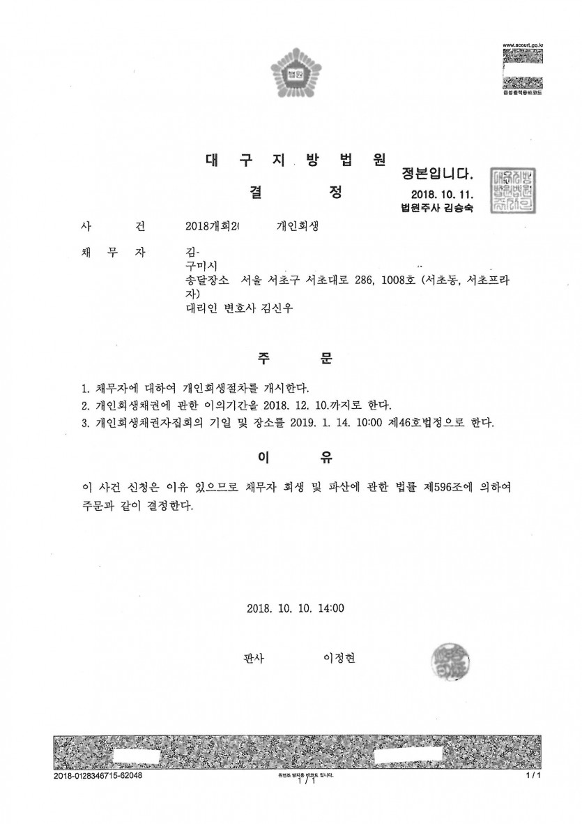 ***쌍둥이 형제가 같이 개인회생을 신청하였으며, 신청당시와 직장이 바뀌어 원금100% 변제에서 64% 변제로 변제금을 줄여서 개시결정이 된 사례입니다.