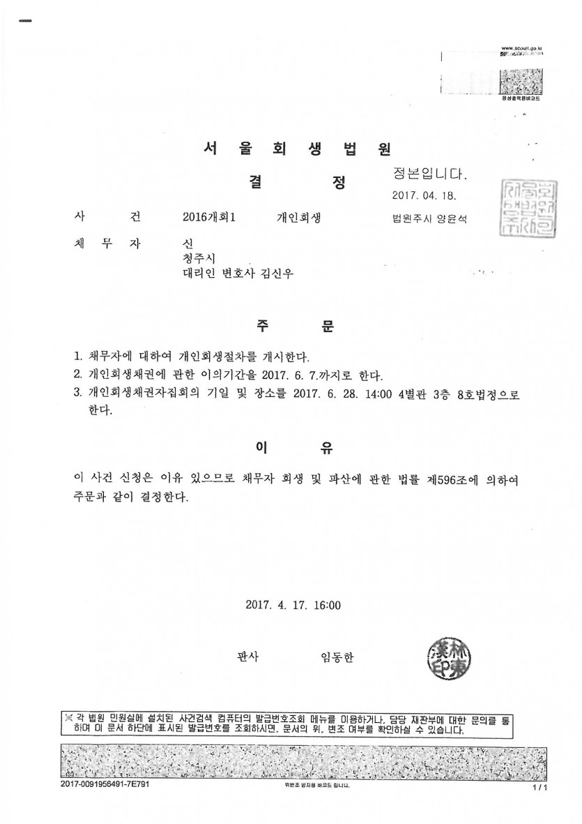 ***개인사채업자가 많아 주소를 알 수 없어 사실조회등으로 주소를 파악한 후 공시송달등으로 송달이 되어 개시결정까지 시일이 많이 소요되었으며, 소명자료가 분명하지 않았지만 채권자로 인정받았고, 13%의 낮은 변제율로 개시결정이 된 사례입니다.​