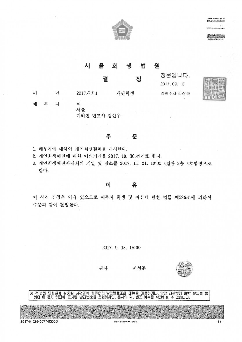***오토바이 사고로 수리비등 손실을 입고, 병원비 등으로 들어가는 돈이 많다보니 채무가 늘어났으며, 개시결정까지 2개월의 짧은 시간이 소요되었습니다.